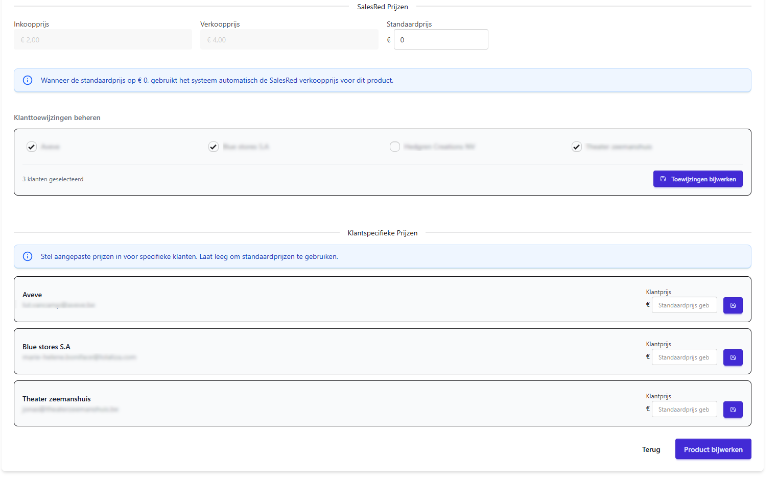 Voor welke klanten dit product getoond zal worden en per klant een in te vullen prijs voor deze specifieke klant.