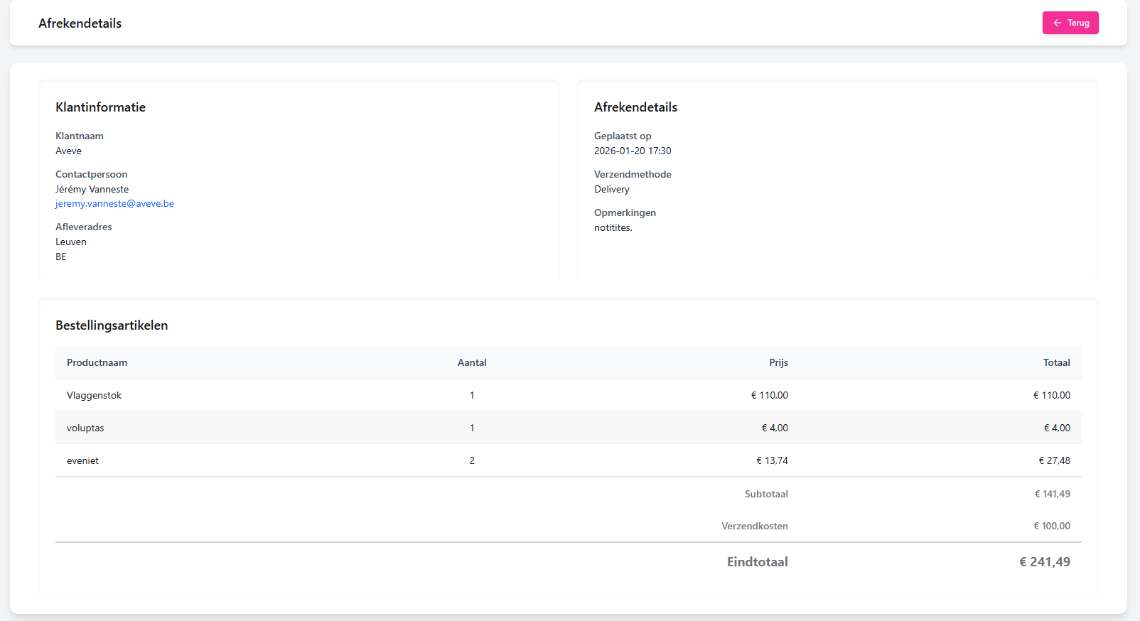 Bij elke bestelling is er een detail overzicht beschikbaar als je doorklikt op de regel met daarin de bestelde producten en meer details