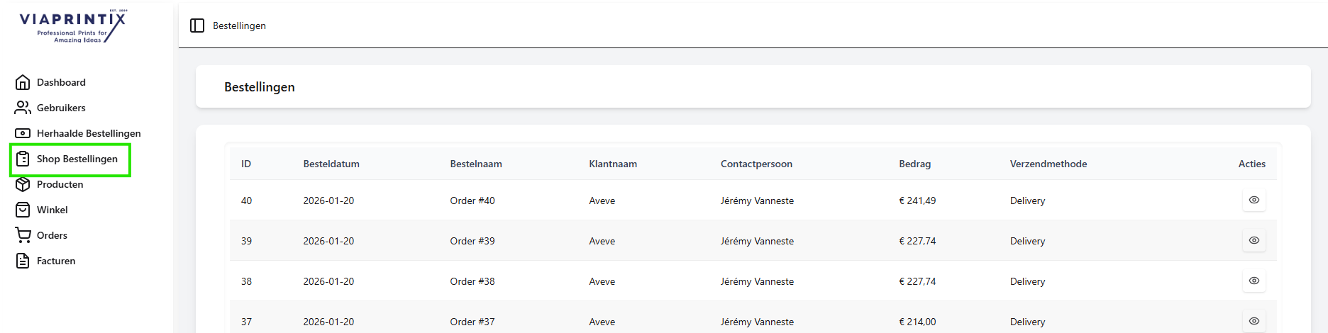 Op de Shop bestellingen pagina vind je de bestellingen die via de shop zijn gedaan: